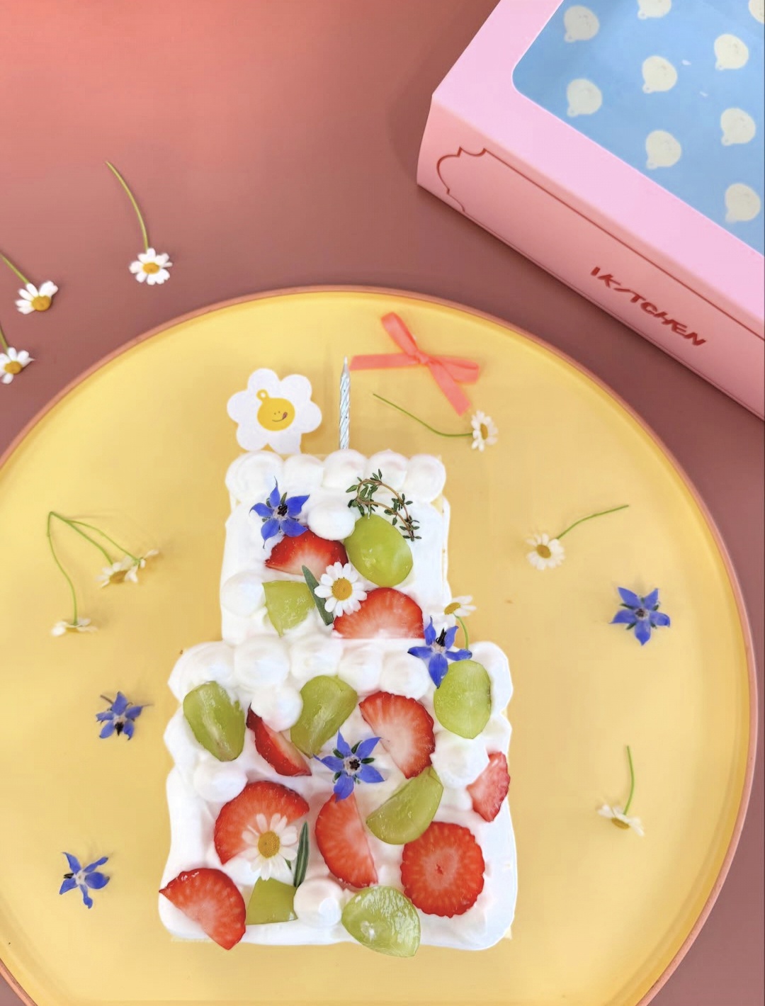 생화(식용꽃)와 신선한 과일로 장식한 눕케이크