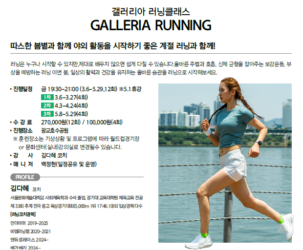 건강한 삶을 위한 육상전문 김다혜코치와 함께하는 갤러리아러닝 클래스와 함께하세요.