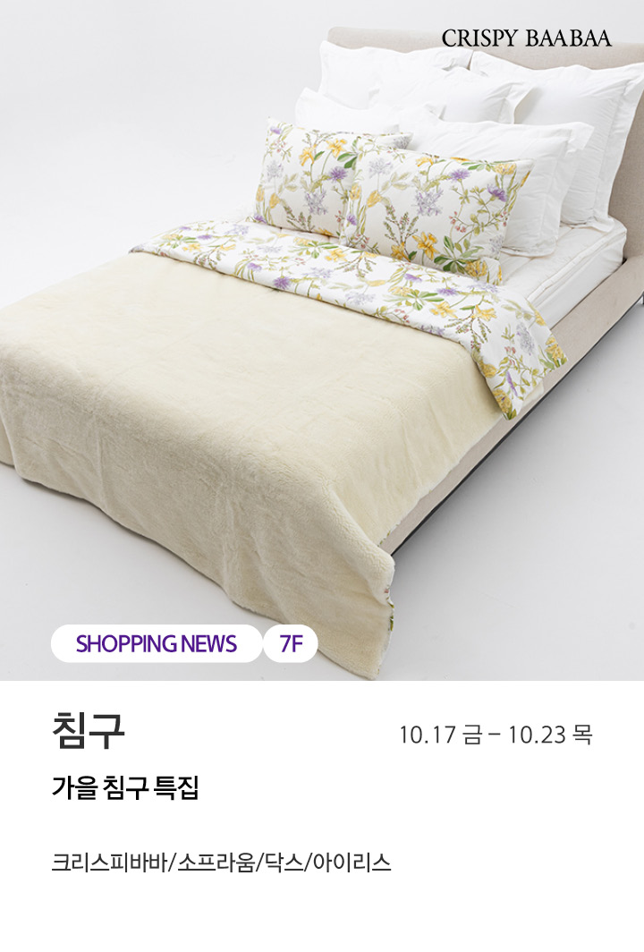상품행사 침구 가을 침구 특집 10.17 금 - 10.23 목 페이스북에 공유하기 카카오스토리로 공유하기 PREV 목록 NEXT 설 선물세트 예약 판매는 아래 번호로 문의 부탁드립니다. 센터시티 041.411.5309, 5311 확인