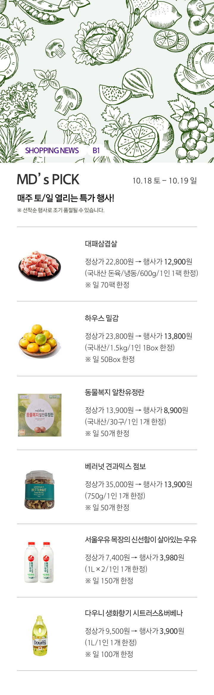상품행사 MD’s PICK 매주 토/일 열리는 특가 행사 10.18 토 - 10.19 일 페이스북에 공유하기 카카오스토리로 공유하기 PREV 목록 NEXT 설 선물세트 예약 판매는 아래 번호로 문의 부탁드립니다. 센터시티 041.411.5309, 5311 확인