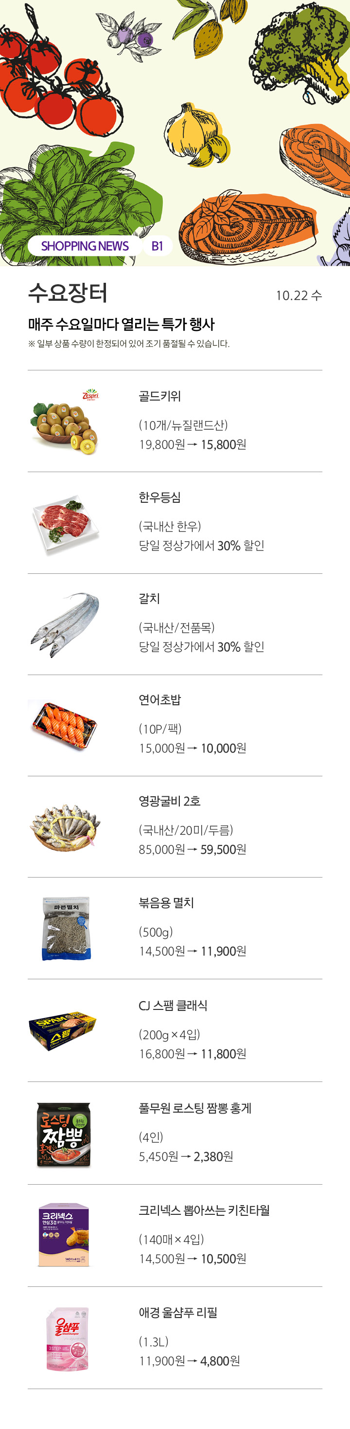 상품행사 매주 수요일마다 열리는 특가 행사 10.22 수 페이스북에 공유하기 카카오스토리로 공유하기 PREV 목록 NEXT 설 선물세트 예약 판매는 아래 번호로 문의 부탁드립니다. 센터시티 041.411.5309, 5311 확인