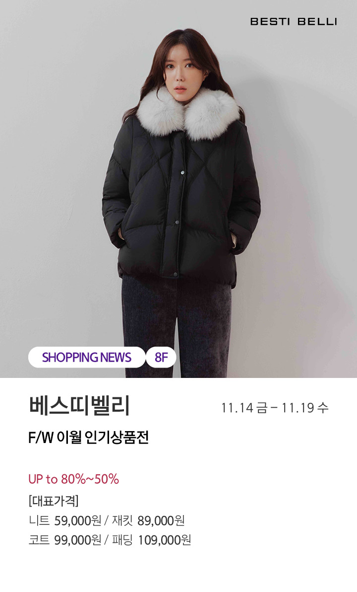 상품행사 베스띠벨리 F/W 이월 인기상품전 11.14 금 - 11.19 수 페이스북에 공유하기 카카오스토리로 공유하기 PREV 목록 NEXT 설 선물세트 예약 판매는 아래 번호로 문의 부탁드립니다. 센터시티 041.411.5309, 5311 확인