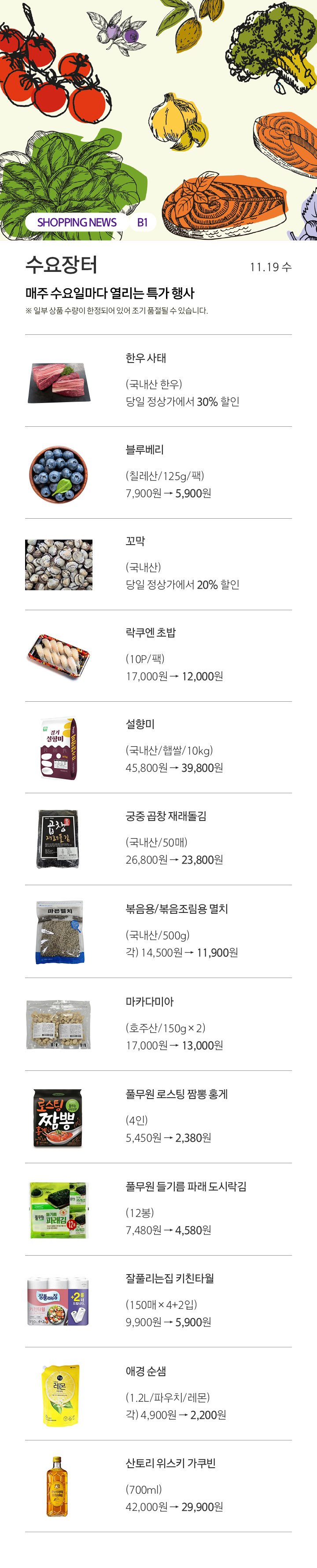 상품행사 수요장터 매주 수요일마다 열리는 특가 행사 11.19 수 페이스북에 공유하기 카카오스토리로 공유하기 PREV 목록 NEXT 설 선물세트 예약 판매는 아래 번호로 문의 부탁드립니다. 센터시티 041.411.5309, 5311 확인