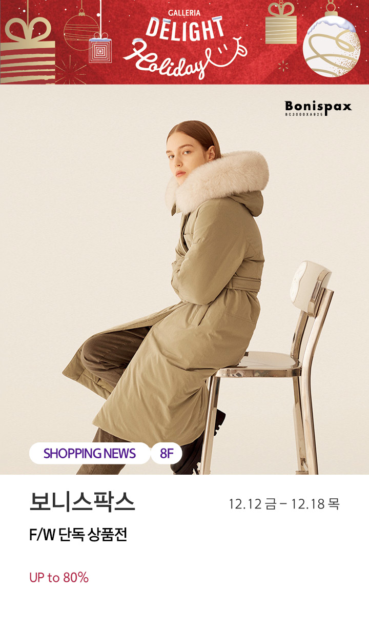 상품행사 보니스팍스 F/W 단독 상품전 12.12 금 - 12.18 목 페이스북에 공유하기 카카오스토리로 공유하기 PREV 목록 NEXT 설 선물세트 예약 판매는 아래 번호로 문의 부탁드립니다. 센터시티 041.411.5309, 5311 확인
