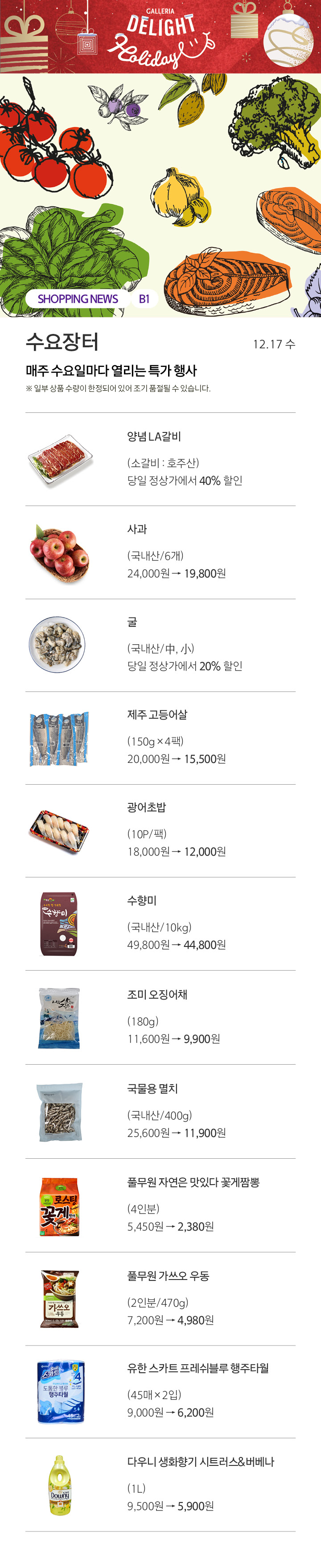 상품행사 수요장터 매주 수요일마다 열리는 특가 행사 12.17 수 페이스북에 공유하기 카카오스토리로 공유하기 PREV 목록 NEXT 설 선물세트 예약 판매는 아래 번호로 문의 부탁드립니다. 센터시티 041.411.5309, 5311 확인