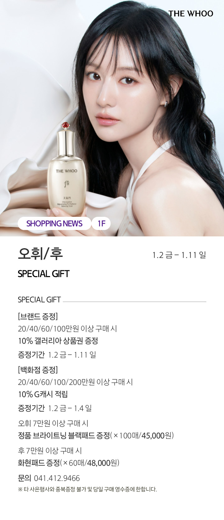 상품행사 오휘/후 SPECIAL GIFT 1.2 금 - 1.11 일 페이스북에 공유하기 카카오스토리로 공유하기 PREV 목록 NEXT 설 선물세트 예약 판매는 아래 번호로 문의 부탁드립니다. 센터시티 041.411.5309, 5311 확인