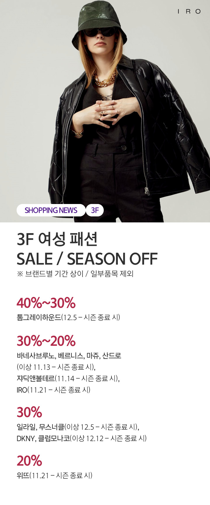 상품행사 3F 여성 패션 SALE / SEASON OFF 브랜드별 기간 상이 페이스북에 공유하기 카카오스토리로 공유하기 PREV 목록 NEXT 설 선물세트 예약 판매는 아래 번호로 문의 부탁드립니다. 센터시티 041.411.5309, 5311 확인