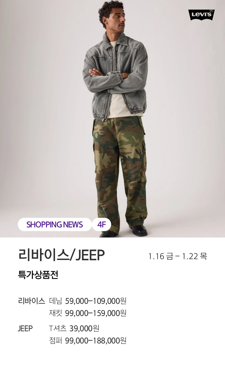 상품행사 리바이스/JEEP 특가상품전 1.16 금 - 1.22 목 페이스북에 공유하기 카카오스토리로 공유하기 PREV 목록 NEXT 설 선물세트 예약 판매는 아래 번호로 문의 부탁드립니다. 센터시티 041.411.5309, 5311 확인