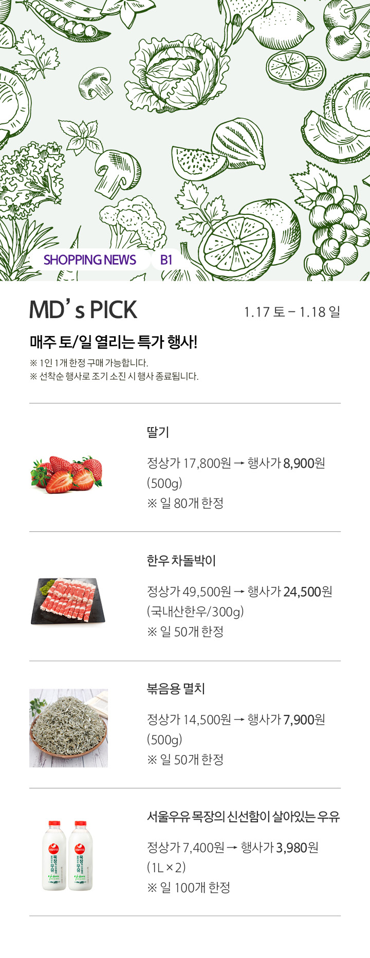 상품행사 MD’s PICK 매주 토/일 열리는 특가 행사! 1.17 토 - 1.18 일 페이스북에 공유하기 카카오스토리로 공유하기 PREV 목록 NEXT 설 선물세트 예약 판매는 아래 번호로 문의 부탁드립니다. 센터시티 041.411.5309, 5311 확인