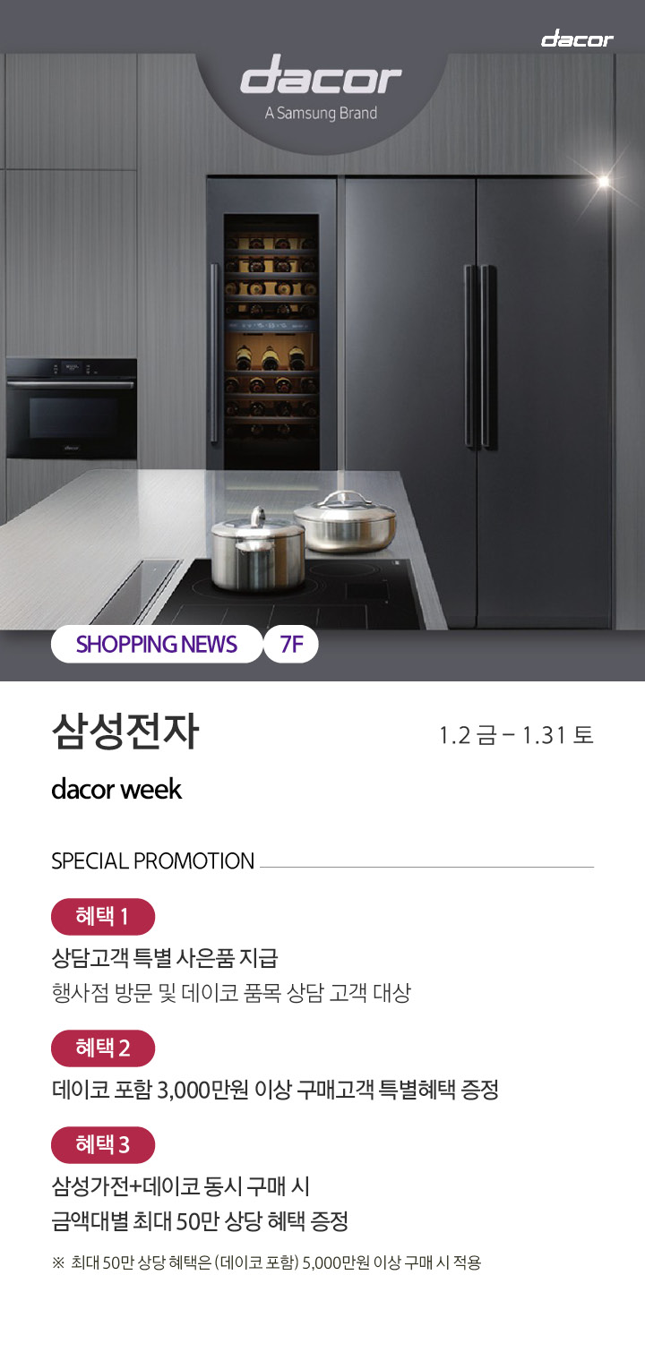 상품행사 삼성전자 dacor week 1.2 금 - 1.31 토 페이스북에 공유하기 카카오스토리로 공유하기 PREV 목록 NEXT 설 선물세트 예약 판매는 아래 번호로 문의 부탁드립니다. 센터시티 041.411.5309, 5311 확인