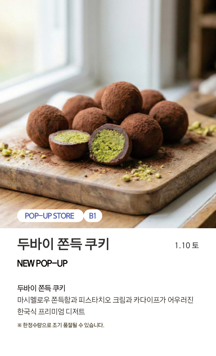 상품행사 두바이 쫀득 쿠키 NEW POP-UP 1.10 토 페이스북에 공유하기 카카오스토리로 공유하기 PREV 목록 NEXT 설 선물세트 예약 판매는 아래 번호로 문의 부탁드립니다. 센터시티 041.411.5309, 5311 확인