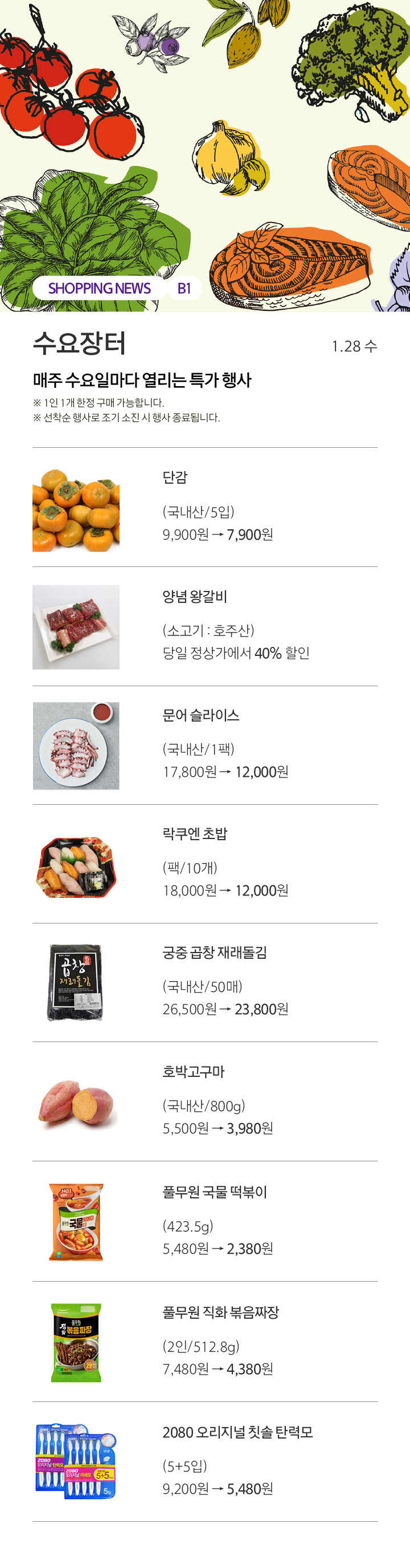 상품행사 수요장터 매주 수요일마다 열리는 특가 행사 1.28 수 페이스북에 공유하기 카카오스토리로 공유하기 PREV 목록 NEXT 설 선물세트 예약 판매는 아래 번호로 문의 부탁드립니다. 센터시티 041.411.5309, 5311 확인