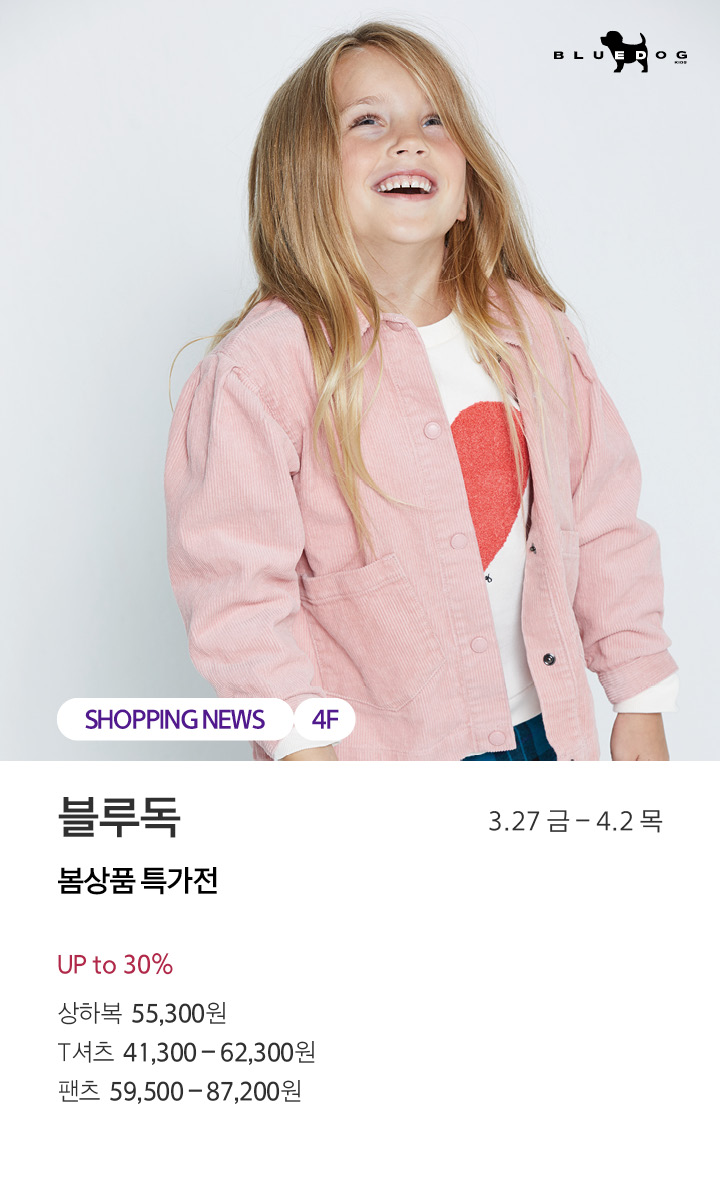 상품행사 블루독 봄상품 특가전 3.27 금 - 4.2 목 페이스북에 공유하기 카카오스토리로 공유하기 PREV 목록 NEXT 설 선물세트 예약 판매는 아래 번호로 문의 부탁드립니다. 센터시티 041.411.5309, 5311 확인