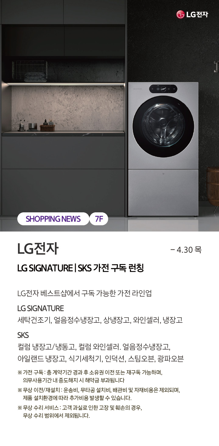 상품행사 LG전자 LG SIGNATURE | SKS 가전 구독 런칭 - 4.30 목 페이스북에 공유하기 카카오스토리로 공유하기 PREV 목록 NEXT 설 선물세트 예약 판매는 아래 번호로 문의 부탁드립니다. 센터시티 041.411.5309, 5311 확인