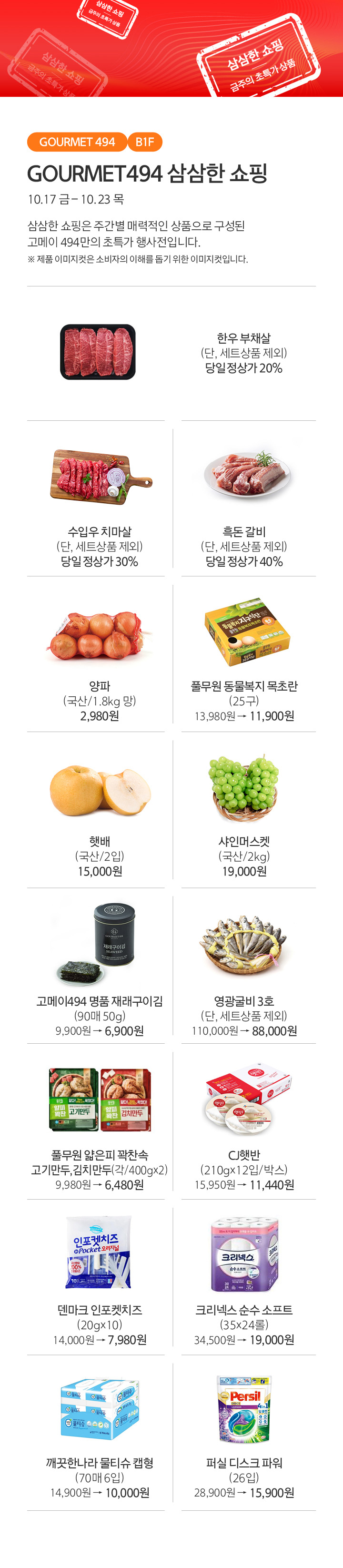 상품행사 GOURMET 494 10.17-10.23, B1F 페이스북에 공유하기 카카오스토리로 공유하기 PREV 목록 NEXT 설 선물세트 예약 판매는 아래 번호로 문의 부탁드립니다. 광교 031.5174.6096-9 확인