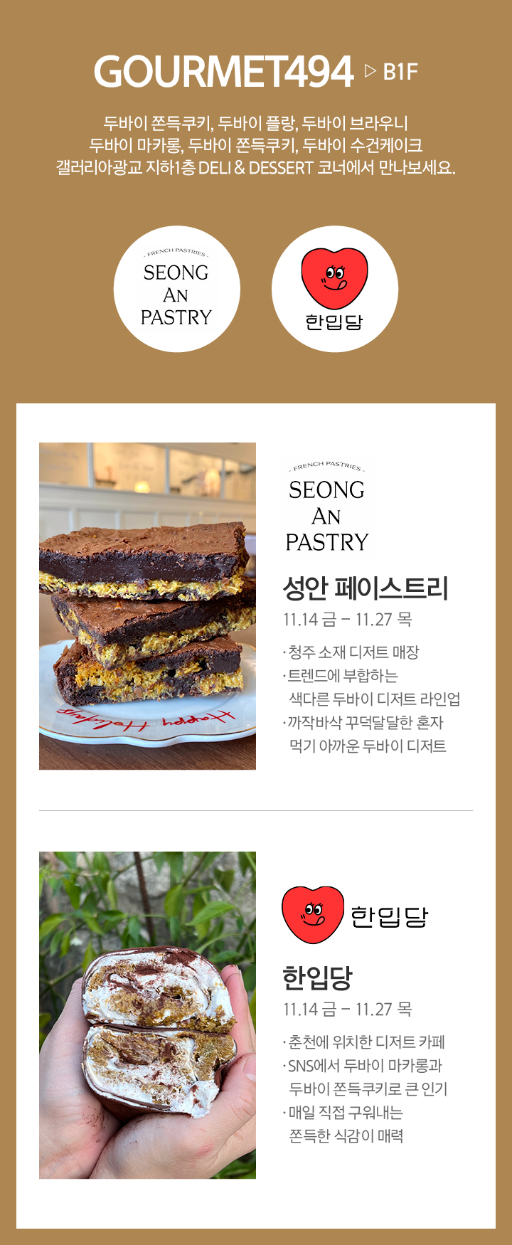 뉴오프닝&팝업 GOURMET 494 11.14- 11.27, B1F 페이스북에 공유하기 카카오스토리로 공유하기 PREV 목록 NEXT 설 선물세트 예약 판매는 아래 번호로 문의 부탁드립니다. 광교 031.5174.6096-9 확인