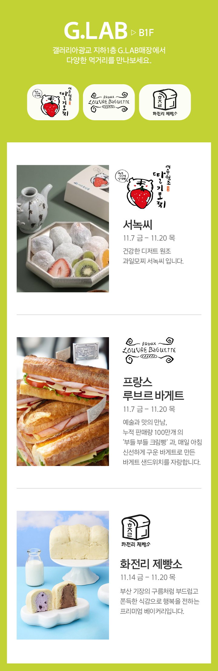 뉴오프닝&팝업 G.LAB 11.7-1120, B1F 페이스북에 공유하기 카카오스토리로 공유하기 PREV 목록 NEXT 설 선물세트 예약 판매는 아래 번호로 문의 부탁드립니다. 광교 031.5174.6096-9 확인