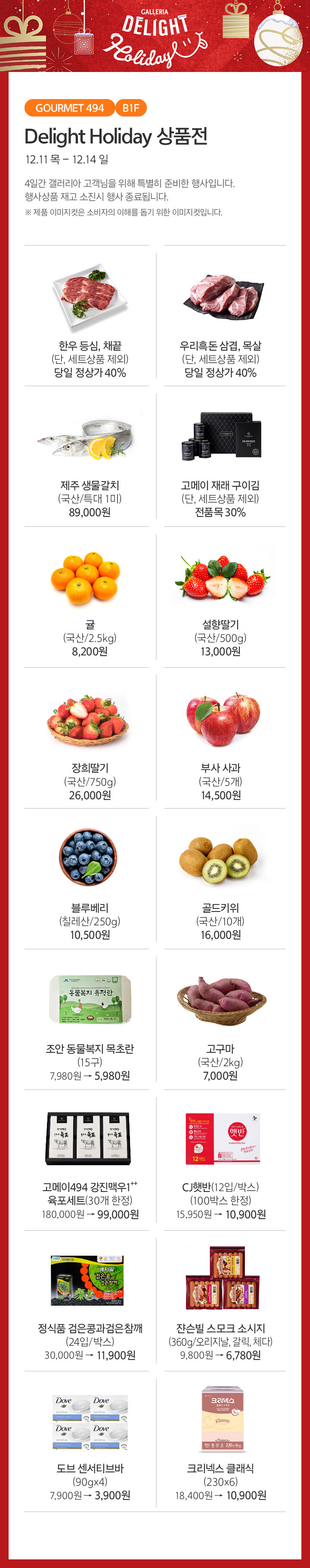 상품행사 GOURMET 494 12.11-12.14, B1F 페이스북에 공유하기 카카오스토리로 공유하기 PREV 목록 NEXT 설 선물세트 예약 판매는 아래 번호로 문의 부탁드립니다. 광교 031.5174.6096-9 확인
