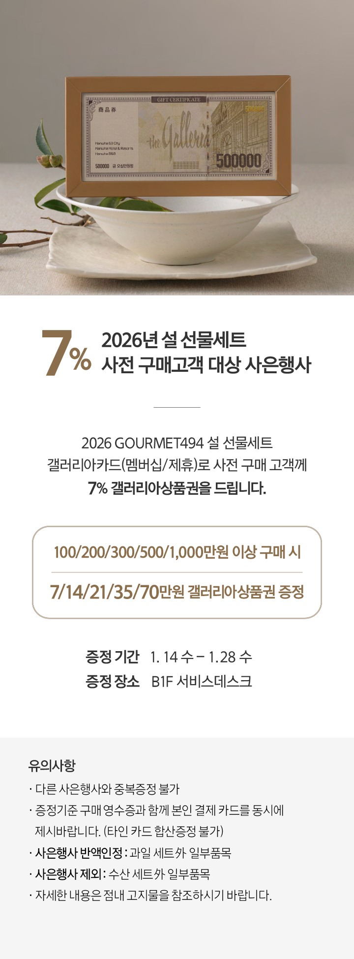 상품행사 7% 상품권 증정 1.14-1.28 ,B1F 서비스데스크 페이스북에 공유하기 카카오스토리로 공유하기 PREV 목록 NEXT 설 선물세트 예약 판매는 아래 번호로 문의 부탁드립니다. 광교 031.5174.6096-9 확인