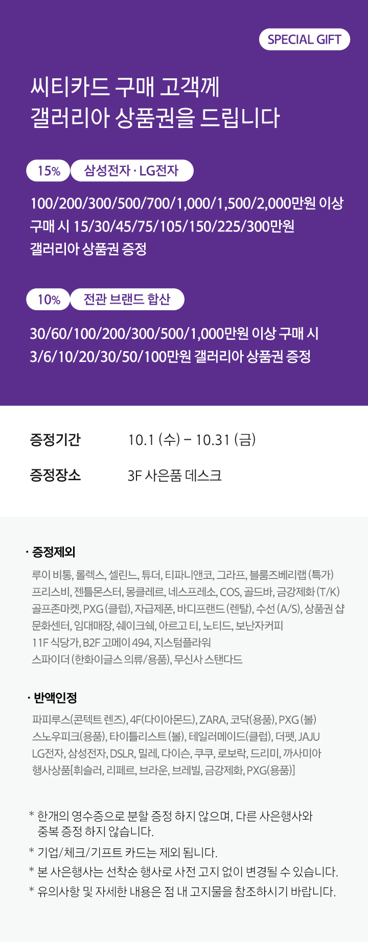 사은행사 씨티카드 사은 혜택 씨티카드 구매 고객께 갤러리아 상품권을 드립니다 페이스북에 공유하기 카카오스토리로 공유하기 이벤트 기간 10.1 (수) - 10.31 (금) PREV 목록 NEXT