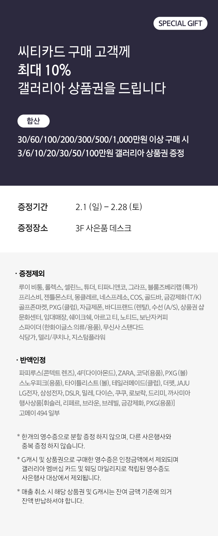 사은행사 씨티카드 사은 혜택 씨티카드 구매 고객께 갤러리아 상품권을 드립니다 페이스북에 공유하기 카카오스토리로 공유하기 이벤트 기간 2.1 (일) - 2.28 (토) PREV 목록 NEXT
