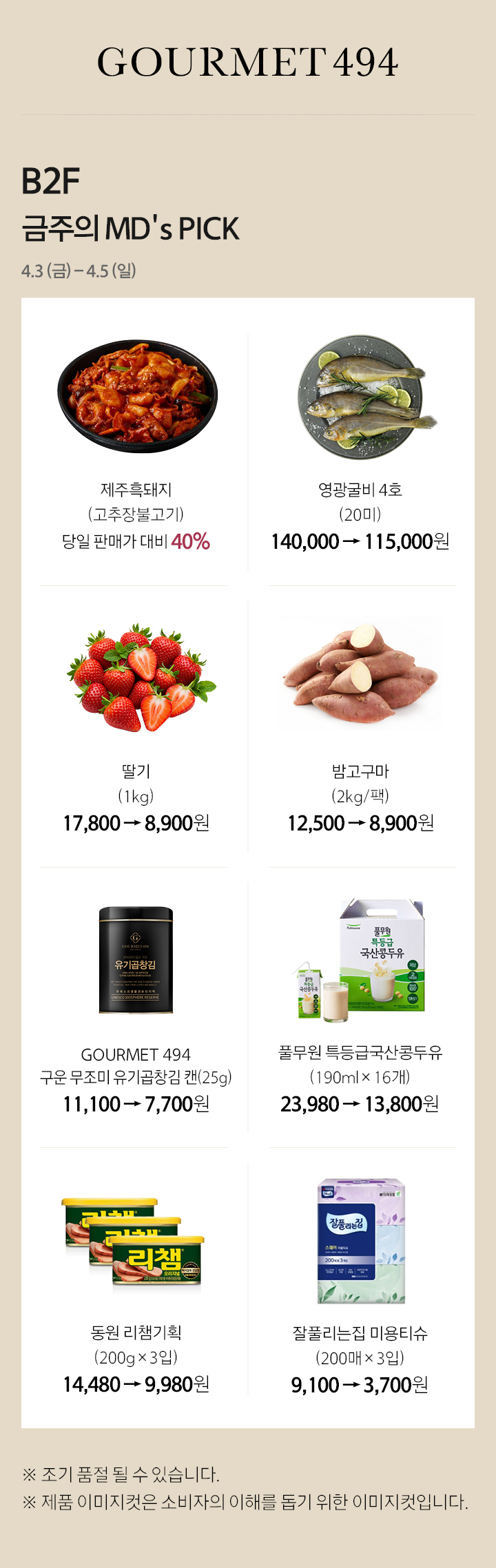 상품행사 GOURMET 494 금주의 MD's PICK 4.3 - 4.5, B2F GOURMET 494 페이스북에 공유하기 카카오스토리로 공유하기 PREV 목록 NEXT 설 선물세트 예약 판매는 아래 번호로 문의 부탁드립니다. 타임월드 042.480.5587 확인