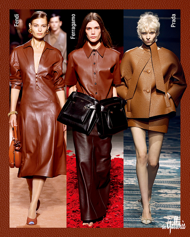 이번 시즌엔 차분하면서도 따뜻한 브라운 컬러 가죽 아이템이 런웨이를 점령했다. 머리부터 발끝까지 다양한 가죽 아이템이 등장했는데, 소재 특유의 고급스러운 광택을 강조해 한층 세련된 분위기를 풍긴다. 프라다는 상하의에 가죽 특유의 빈티지한 텍스처를 그대로 살린 셋업을 선보였고, 펜디는 미니멀한 브라운 가죽 드레스에 볼드한 골드 주얼리로 포인트를 주었다.