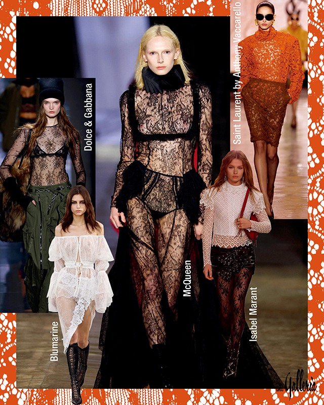 다수의 디자이너들이 추위는 아랑곳하지 않고 낭만을 찾아 떠난 듯하다. 두껍고 무거운 아우터를 뒤로한 채 얇고 섬세한 레이스 장식을 적극 활용했으니 말이다. 맥퀸은 섬세한 손길로 완성한 블랙 레이스 드레스로 빅토리아 스타일을 완성한 반면, 블루마린은 속이 훤히 들여다보이는 화이트 레이스 오프숄더 블라우스와 슬릿 스커트로 여리여리한 분위기를 강조했다. 레이스 아이템을 좀 더 힙하게 연출하고 싶다면, 돌체 앤 가바나의 런웨이를 참고할 것. 몸에 딱 붙는 슬림한 레이스 톱에 오버사이즈 카고 팬츠를 매치해 반전 매력을 꾀했다.