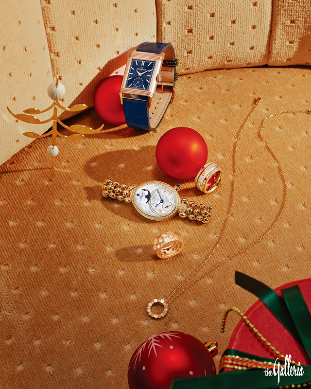 (위부터 시계 방향) JAEGER-LECOULTRE 20겹의 래커 코팅을 거친 딥 블루의 선레이 래커 다이얼과 인하우스 칼리버 854를 장착한 리베르소 트리뷰트 스몰 세컨즈. 3천9백90만원 EAST B1 02.6905.3998 WELLENDORFF 18K 옐로 골드에 총 2.88캐럿의 다이아몬드를 세팅하고 하트 에나멜로 포인트를 준 투 하츠 원 소울 링. 1억7천만원대 EAST B1 02.6905.3303 BREGUET 메종 창립 250주년을 기념한 피스로, 18K 브레게 골드에 머더오브펄 다이얼과 어벤추린 문페이즈를 장착해 우아한 레인 드 네이플 9935. 1억2천만원대 EAST B1 02.6905.3571 CHAUMET 핑크 골드에 브릴리언트 컷 다이아몬드를 장식해 허니콤 디자인을 완성한 비 드 쇼메 링과 네크리스. 각 1천8백만원대, 5백만원대 WEST 1F 02.6905.3305 ROYAL COPENHAGEN 마치 주얼리 피스 같은 정교하고 우아한 디자인의 크리스마스 골드 오너먼트 팔메토. 12cm 8만5천원 광교 8F 031.5174.7844