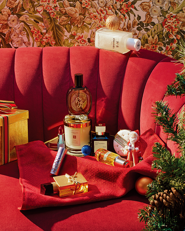 (왼쪽 아래부터 시계 방향) YSL BEAUTY 골드 메탈 주얼리에서 영감을 얻은 패키지에 라벤더와 오렌지 블러썸, 럼 앱솔루트 향을 담은 입생로랑 뷰티의 ‘리브르 바닐라 꾸뛰르 오 드 빠르펭 홀리데이 컬렉션’, 50ml 23만원 WEST 2F 02.512.0406 NARS 패션 디자이너 아이리스 반 헤르펜과의 협업을 통해 완성한 홀리데이 컬렉션인 나스의 ‘홀리데이 컬렉션 익스플리싯 립스틱 블레임’, 3.8g 5만2천원 WEST 2F 02.6905.3747 MAC 민트 글리터의 한정판 패키지가 돋보이는 맥의 ‘맥시멀 슬릭 새틴 립스틱 대즐 기프트 컬렉션 #핑크리스트’, 3g 3만9천원 WEST 2F 02.6905.3372 JO MALONE LONDON 크리스마스 아침의 설렘을 담은 향과 홀리데이 글라스 디자인이 돋보이는 조 말론 런던의 ‘파인 앤 유칼립투스 클래식 캔들’, 200g 12만1천원 WEST 2F 02.6905.3767 DIPTYQUE 빛과 그림자의 조화를 강조한 황금빛 리미티드 패키지가 특징으로 플로럴 우디 계열의 향이 돋보이는 딥티크의 ‘리미티드 오르페옹 오 드 퍼퓸’, 75ml 28만9천원 WEST 1F 02.6905.3511 CHANEL 화이트 골드 펄 입자가 피부를 은은하게 빛내고 플로럴 부케 향이 긴 여운을 남기는 샤넬의 ‘N°5 화이트 골드 바디 오일’, 250ml 18만2천원 WEST 2F 02.3442.1043 DIOR 홀리데이를 맞이해 눈부신 별들이 쏟아지는 하늘 아래 펼쳐지는 환희와 놀라움을 담은 리미티드 컬렉션인 디올의 ‘디올 포에버 쿠션 케이스’, 4만5천원대 타임월드 1F 042.720.6357 ROYAL COPENHAGEN 로얄 코펜하겐의 아이코닉한 블루 플레인 커피포트를 들고 있는 2025 크리스마스 산타 할아버지 피규린. 14만원 광교 8F 031.5174.7844 LA MER 얼굴과 보디 등 다양하게 활용할 수 있는 라 메르의 ‘더 리뉴얼 오일’, 30ml 39만5천원 WEST 2F 02.3446.9022 MAISON FRANCIS KURKDJIAN 스위트 바닐라 어코드에 감미로운 스파이시와 우디, 앰버 향이 어우러진 메종 프란시스 커정의 ‘오우드 엑스트레 드 퍼퓸’, 70ml 63만2천원 WEST 2F 02.6905.3769 ROYAL COPENHAGEN 크리스마스 장식이 아름답게 표현된 스타 플루티드 테이블 매트 2개 1세트. 6만9천원 광교 8F 031.5174.7844