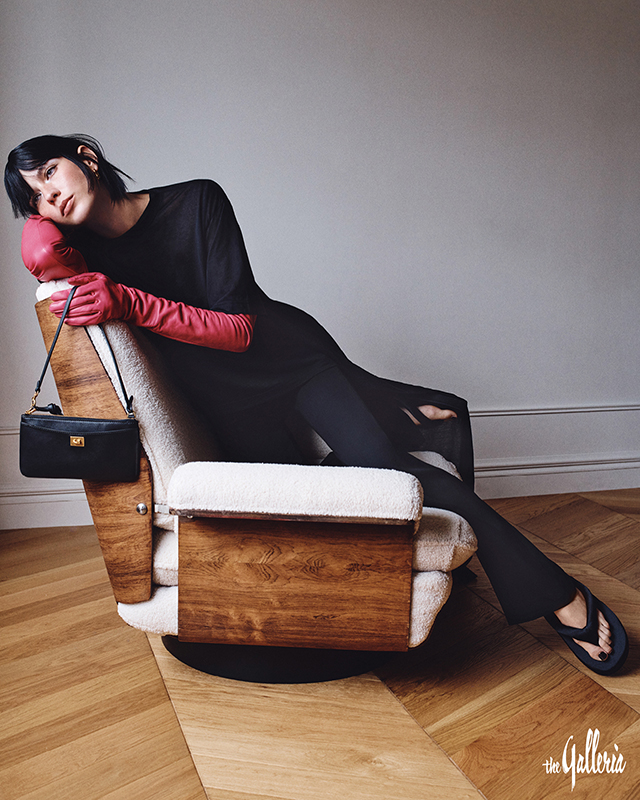 트레인의 길이감이 돋보이는 블랙 톱, 슬림하게 떨어지는 팬츠, 비비드한 핑크 가죽 롱 글러브, 블랙 스무드 카프스킨 소재의 로데오 폰 파우치, 플랫폼이 특징인 샌들.