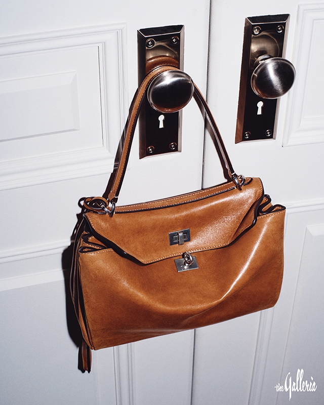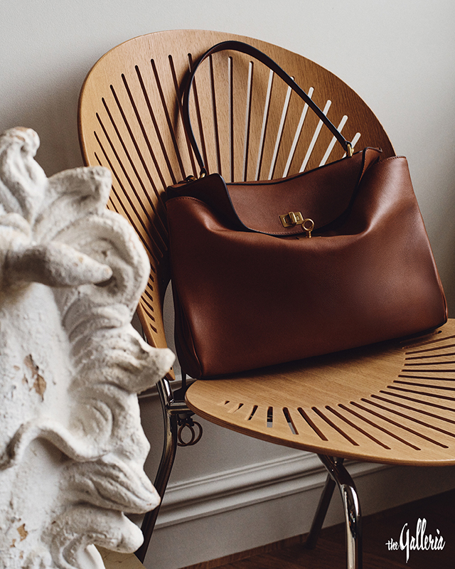 구조적인 디자인의 가죽 재킷, 커팅 디테일이 돋보이는 데님 쇼츠, 라이트 에스프레소 왁스드 스웨이드 카프스킨 소재의 미디엄 르 시티 백. -