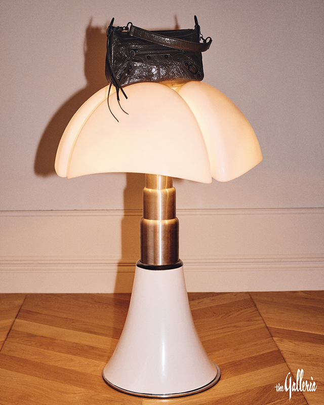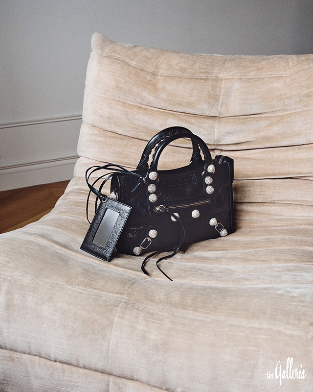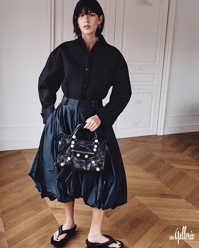 오버사이즈 블랙 셔츠, 볼륨감 있는 퀼로트 팬츠, 하우스의 시그니처인 ‘B’ 이어링, 아레나 램스킨 소재의 르 시티 라인스톤 자이언트 스터드 스몰 백, 플랫폼이 특징인 샌들.