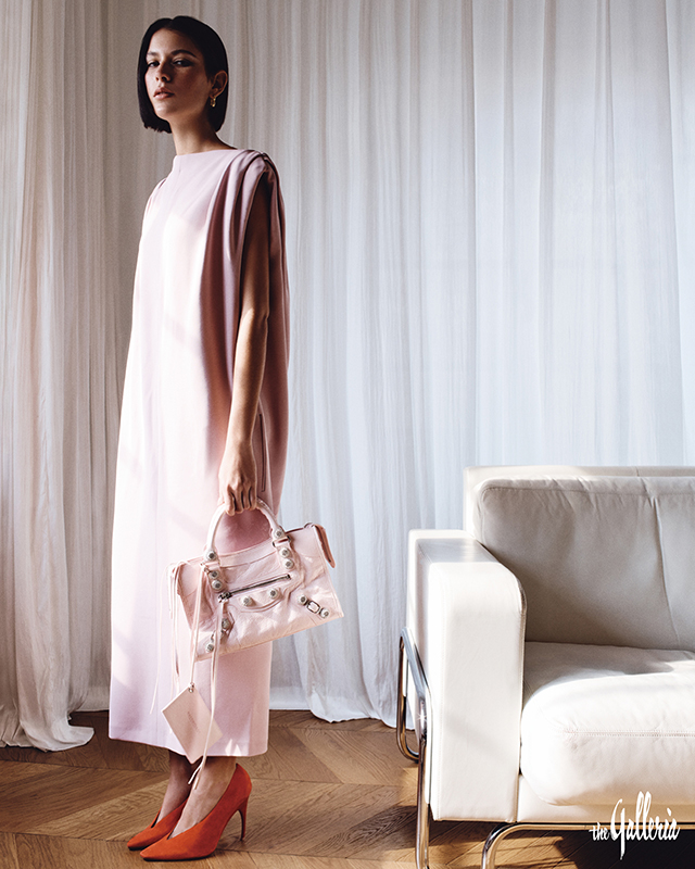 어깨의 셔링 디테일이 특징인 페탈 핑크 슬리브리스 드레스, ‘B’ 로고 이어링, 날렵한 앞코 라인이 매력적인 스틸레토 슈즈, 페탈 핑크 아레나 램스킨 소재의 자이언트 스터드 르 시티 스몰 백. -
