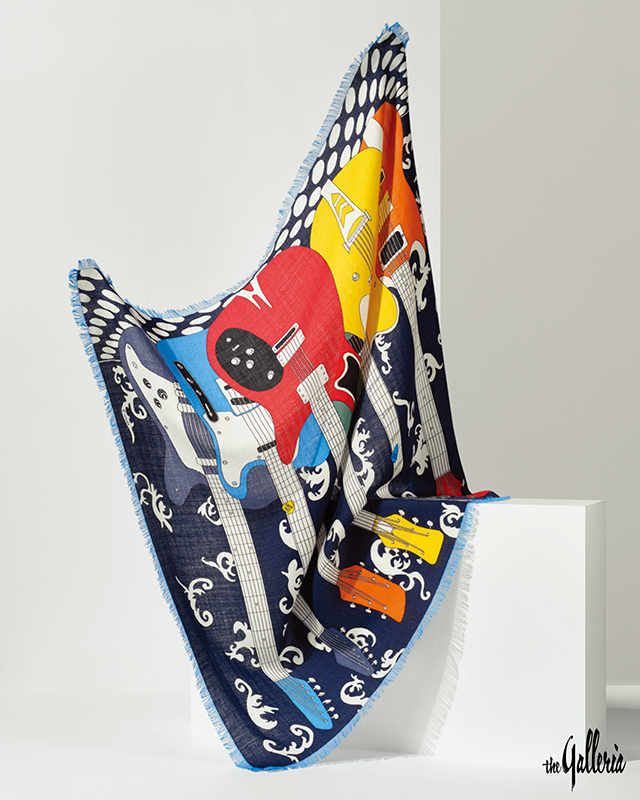 프랑스 출신의 일러스트레이터 카린 브랑코위츠Carine Brancowitz가 그린 6대의 일렉트릭 기타가 당당히 포즈를 취하며 화음을 완성한 ‘온 에어’ 스카프. 캐시미어와 실크 소재로 완성한 이 스카프는 도트와 아칸서스 잎 패턴의 배경 위에 강렬한 색감의 기타가 언제든 음악을 연주할 듯 리드미컬한 모습이 인상적이다. 아우트라인을 감싼 프린지 디테일이 경쾌한 느낌을 더해주는 이 제품은 트렌치코트나 가죽 재킷처럼 간절기 아우터에 두르면 더할 나위 없다. 가격 미정.